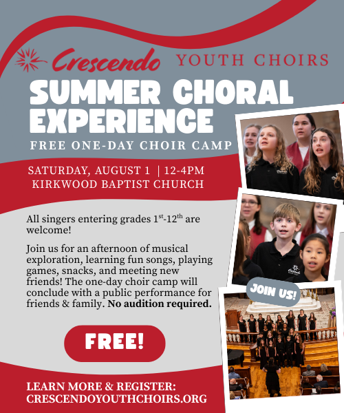 Sign up for Crescendo Youth Choirs’ Summer Choral Experience! Welcoming singers in grades 1st-12th for a FREE day camp on Saturday, August 1st from 12pm-4pm at Kirkwood Baptist Church. The camp will end with a presentation for friends and family at 3:30pm. Come enjoy a FREE afternoon of singing, learning new songs, snacks, games, and connecting with faculty and peers from the Crescendo Youth Choirs! New singers can also audition for the 26-27 season.